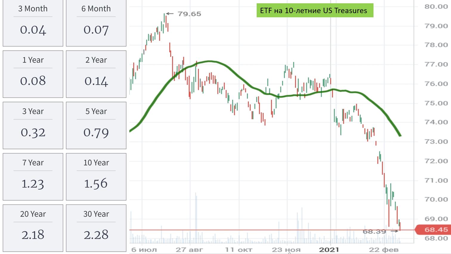 Доходность US Treasures с разными сроками погашения и график ETF на 10-летние US Treasures (падение = рост доходности).