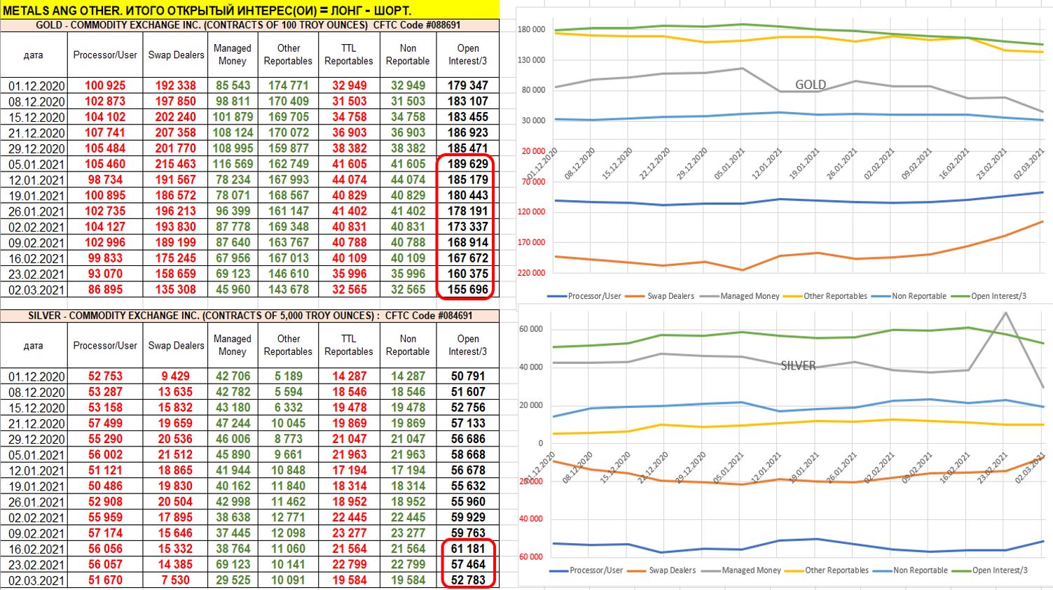 еженедельно по золоту количество открытых контрактов (открытый интерес) на фьючерсных рынках падает