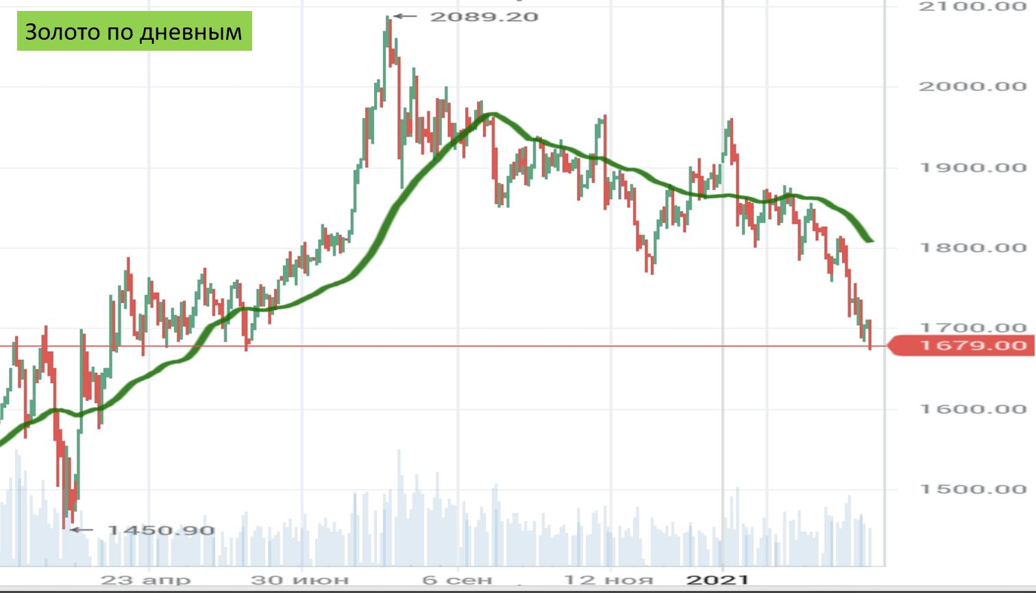 Золото на Comex по дневным (объем с августа 2020г. падает):