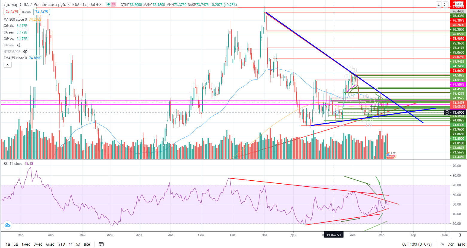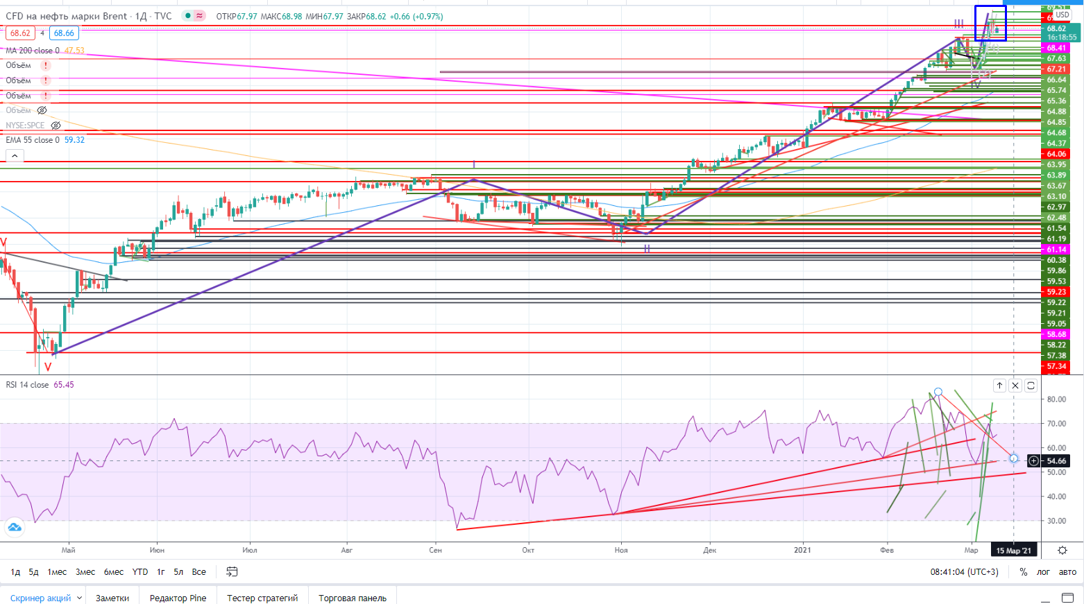 Как я писал накануне (https://www.finam.ru/analysis/marketnews/rossiiyskiiy-rynok-ochen-pugliv-20210305-09400/) — « В «Лукойле» нужно искать уровни для входа в лонг (возможно на уровне 5788 на днях). Похоже на вынос «медвежьих» стопов состоялся, «минибычьи» стопы также сработали, но пока нефть растет можно рисковать и торговать от покупки…).