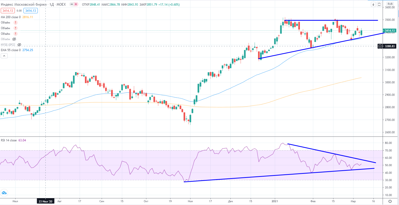 При внешнем позитиве нефтяного сектора индекс ММВБ вырос, но далек от выхода из треугольника, да и особо не сильно оторвался от 3400. Так что эта нефтяная эйфория не сильно пока повлияла на общий рынок в глобальном плане.