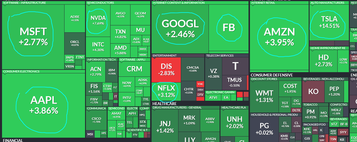 Достаточно посмотреть на тепловую карту рынка, чтобы увидеть куда потекут новые стимулы, это прежде всего биг тех и «модные» компании, — электрический чайник ты просто космос, - Тесла ;), майни крипту с помощью карт NVDIA, прилипни к телеку или гаджету и смотри, что тебе зальёт Netflix...