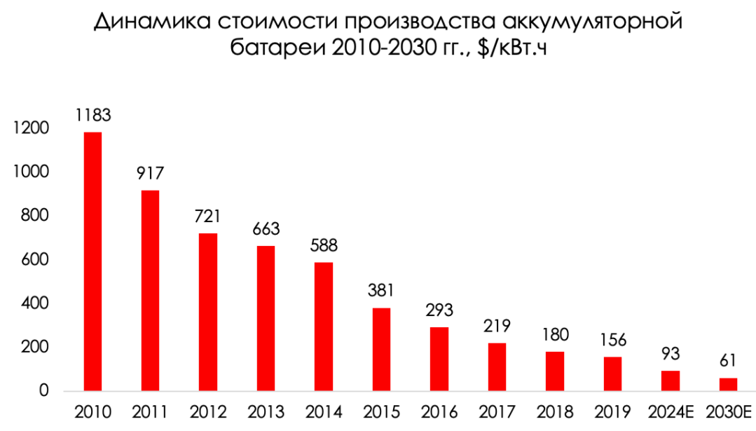 Основным толчком роста спроса на электрические автомобили будет их постепенное удешевление за счет ключевой статьи расходов автомобильных компаний — энергетических батарей. По данным BNEF, с 2010 года по 2019 год стоимость производства литий-ионных аккумуляторов снизилась практически в 8 раз до 156 $/кВт. ч. К 2030 году показатель может снизиться до 61 $/кВт. ч.