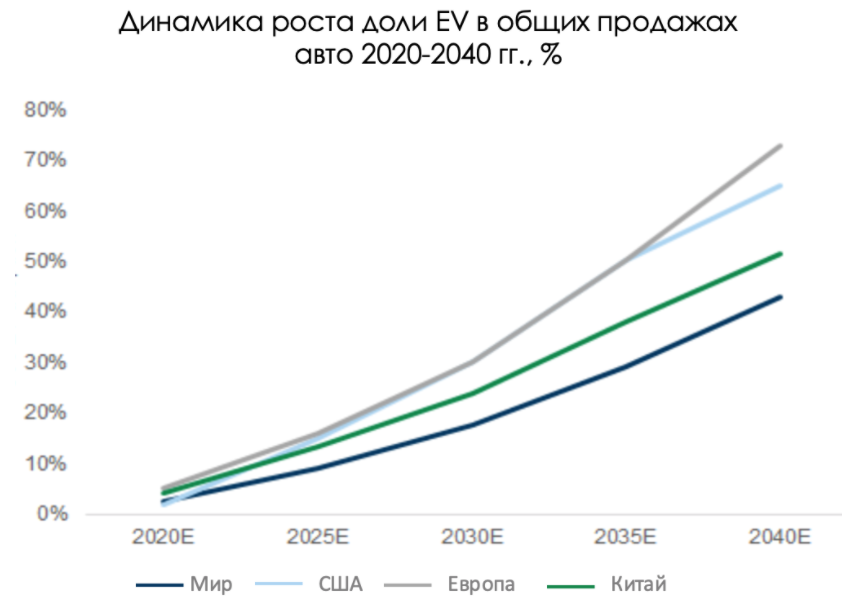 Постепенное введение более жестких ограничений на использование машин на двигателях внутреннего сгорания (ДВС) в странах Европы, Китае, а также США приведет к ускорению перехода производителей на электрические машины. Ожидается, что к 2030 году доля продаваемых электрических автомобилей достигнет 25% в Китае, 30% в США, а также 30% в Европе благодаря росту тренда на ответственное отношение к природе и выполнению Парижского соглашения о снижении углеродного следа.