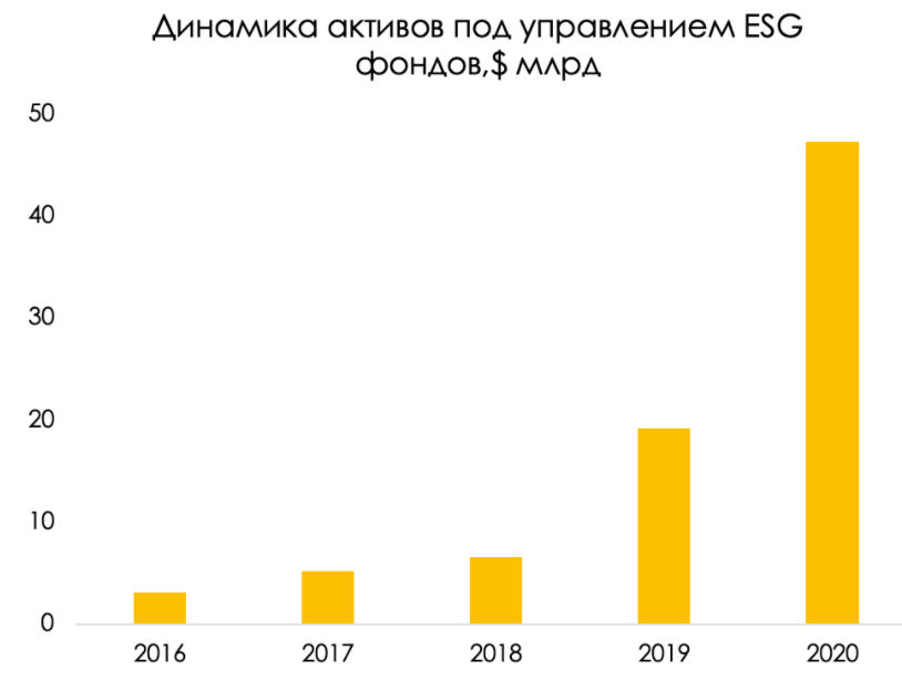 За 2020 год объём активов под управлением фондов, инвестирующих в компании с высоким уровнем развития ESG направления, увеличился практически в 2 раза до $47 млрд.