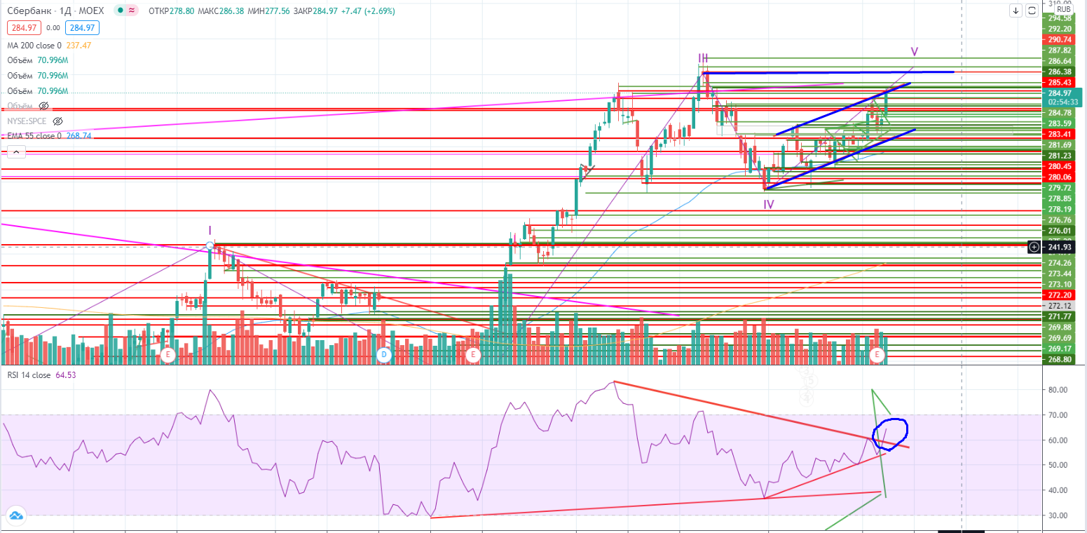В Сбере пришлось перестроить волны, сейчас в V-ой волне. При сломе потенциальной дивергенции нужно будет перерисовывать график с точки зрения волн еще раз!!! Но возможно торговля происходит элементарно в канале с верхней границей 285.5±, тогда интрига еще сильнее.