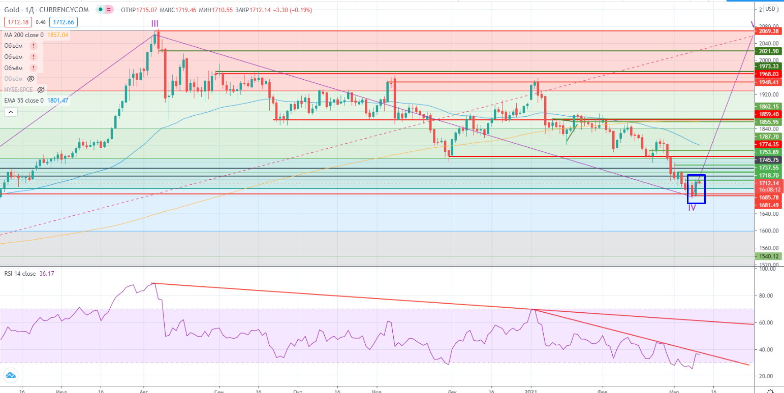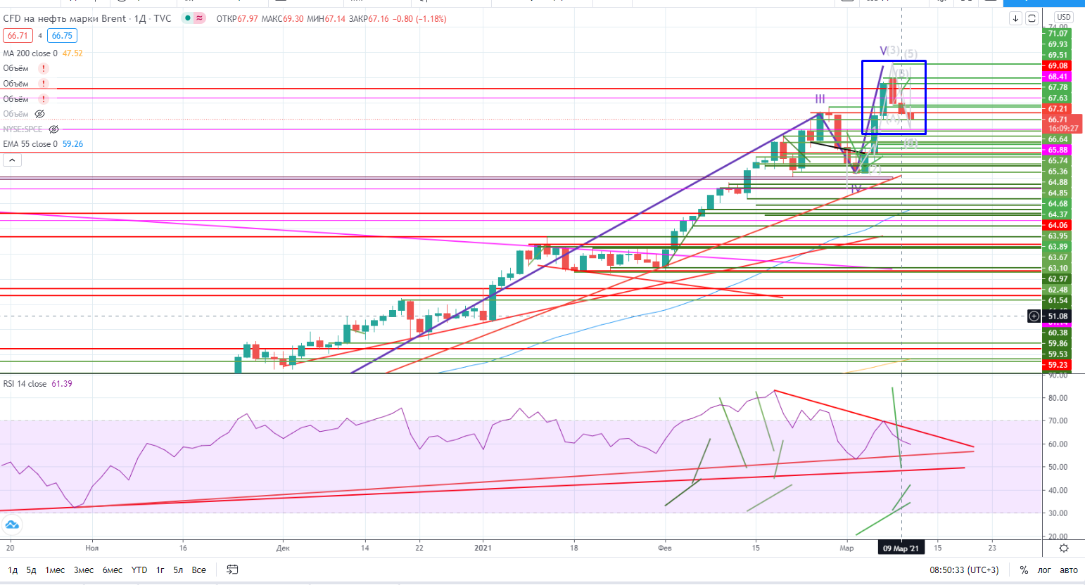 Но возвращаясь к нефти судя по графику очень возможна коррекция. Как я писал накануне ( https://www.finam.ru/analysis/marketnews/torgovat-akciyami-sberbanka-opasno-20210309-09400/) — «Стоит сказать, что нефть уже давно не является тем товаром, на который можно ориентироваться. Цена «оторвалась» от реальности. Она стоит уже настолько высоко, что в пору уже «открывать» добычу сланца в США. Да и страны ОПЕК+ могут уже почти безболезненно наращивать добычу. Все это приведет рано или поздно как минимум к коррекции.». И кроме того дорогая нефть совершенно не подходит для восстановления экономики, ведь транспортные расходы возрастают и сильно. Об этом как-то все забывают.