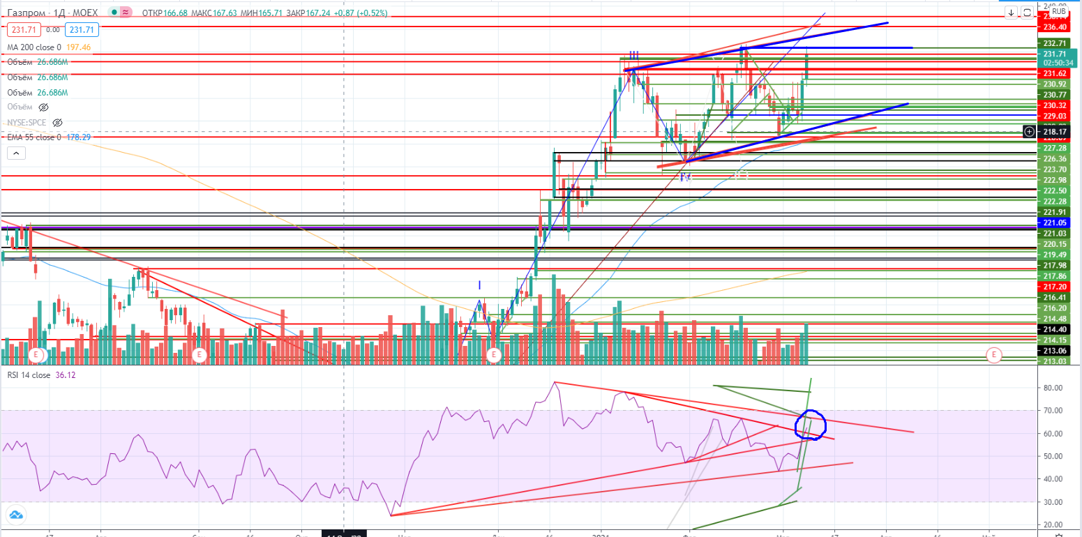 В Газпроме растянутая V-я волна, пока под горизонтальным сопротивлением 232,46 (которое вчера тестировали), кроме этого сопротивлением может выступить «обратная» сторона тренда 234-235, RSI придет к своему основному дивергентному тренду. И даже при пробое его все равно останется потенциальная дивергенция, так что шансы на коррекцию ликвидируется еще не скоро.