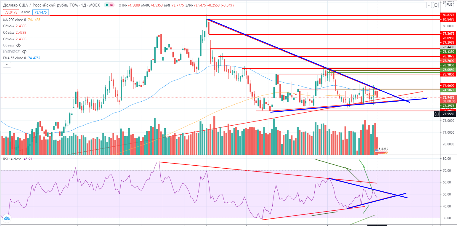 Так к примеру я ждал укрепления доллара, а вышло все наоборот-начал укрепляться рубль. С одной стороны это понятно, все-таки нефть ОЧЕНЬ ВЫСОКА, но почему именно вчера и вниз… Для меня загадка. Но в целом рубль ведет себя адекватно. Возможные санкции снова оказались пока только из разряда «возможных», нефть все таки высоко — вот и начал укрепляться… Но пара продолжает торговлю в треугольнике, который может просто выродится (если уже это не происходит). В валюте пока без идей.