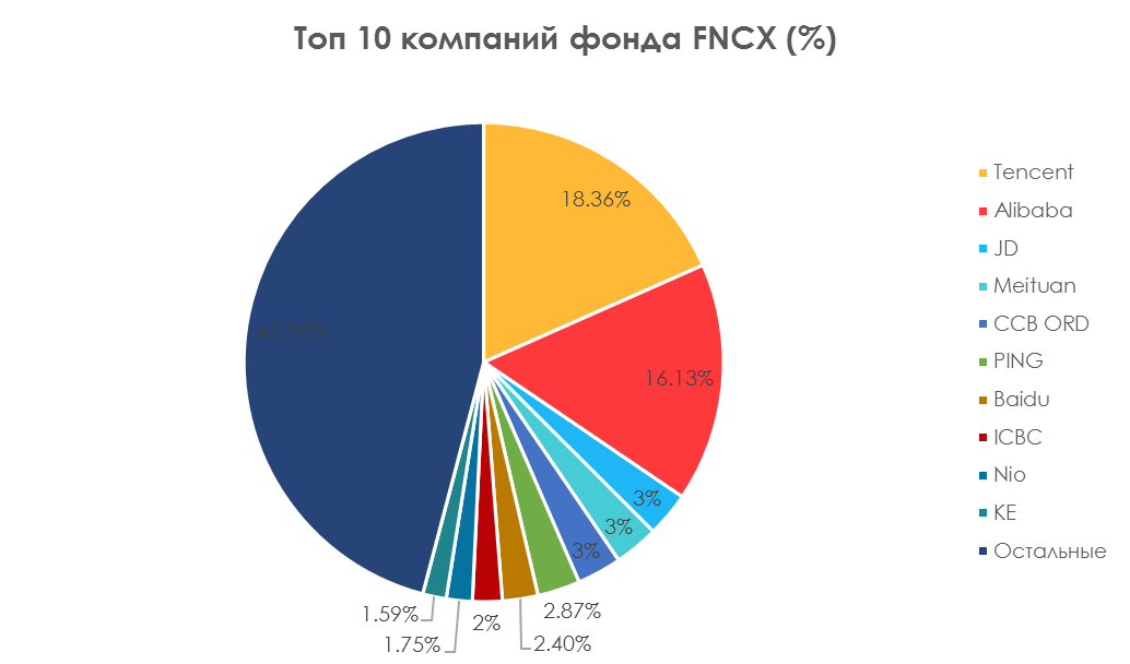 В фонде выделяются 2 компании, суммарно агрегируя 34% индекса — Tencent и Alibaba: