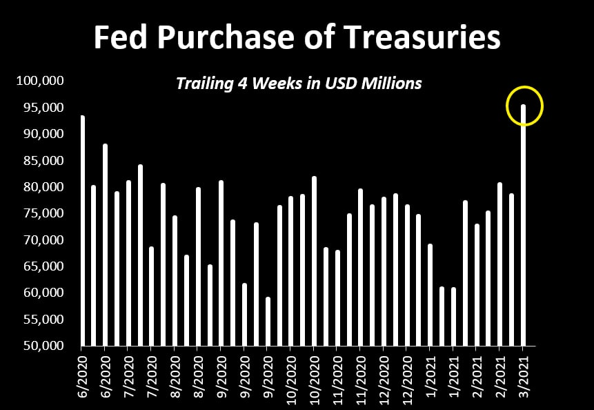 В результате ФРС пытается избежать резкого падения на фондовом рынке, печатая деньги и выкупая облигации. При этом важно понимать, что ожидаемая высокая инфляция связана с бесконтрольным печатанием денег и раздачи их населению. В то же самое время и доходность 10-летних облигаций растёт из-за роста инфляции:
