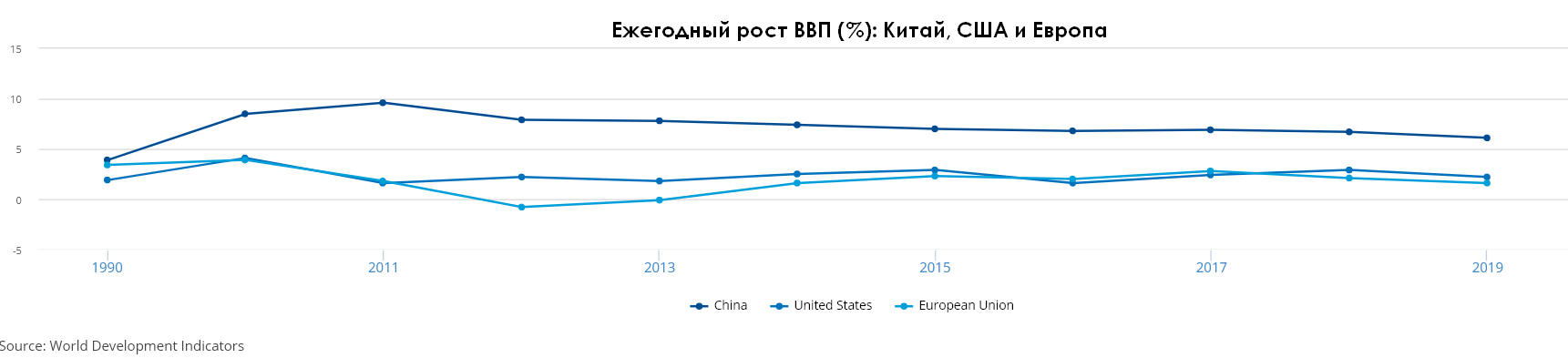 Если посмотреть на данные, то Китай до сих пор растёт в 3 раза быстрее США и Европы: