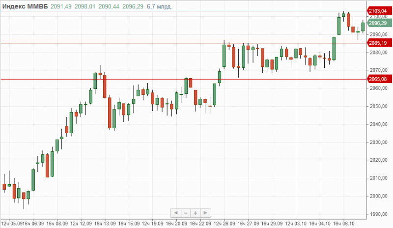 Индекс ММВБ после выхода из консолидации на прошлой неделе вверх, судя по всему рисует новый диапазон 2085п.-2105п. выход из которого будет порядка 50п. по направлению движения.