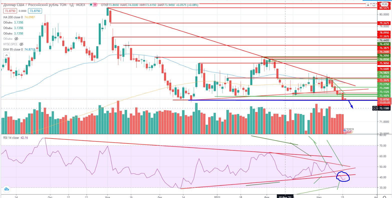 Но это полемика, а на графике проход уровня 72,80 может спровоцировать рубль укрепится еще, благо RSI уже пробил свой дивергентный тренд.