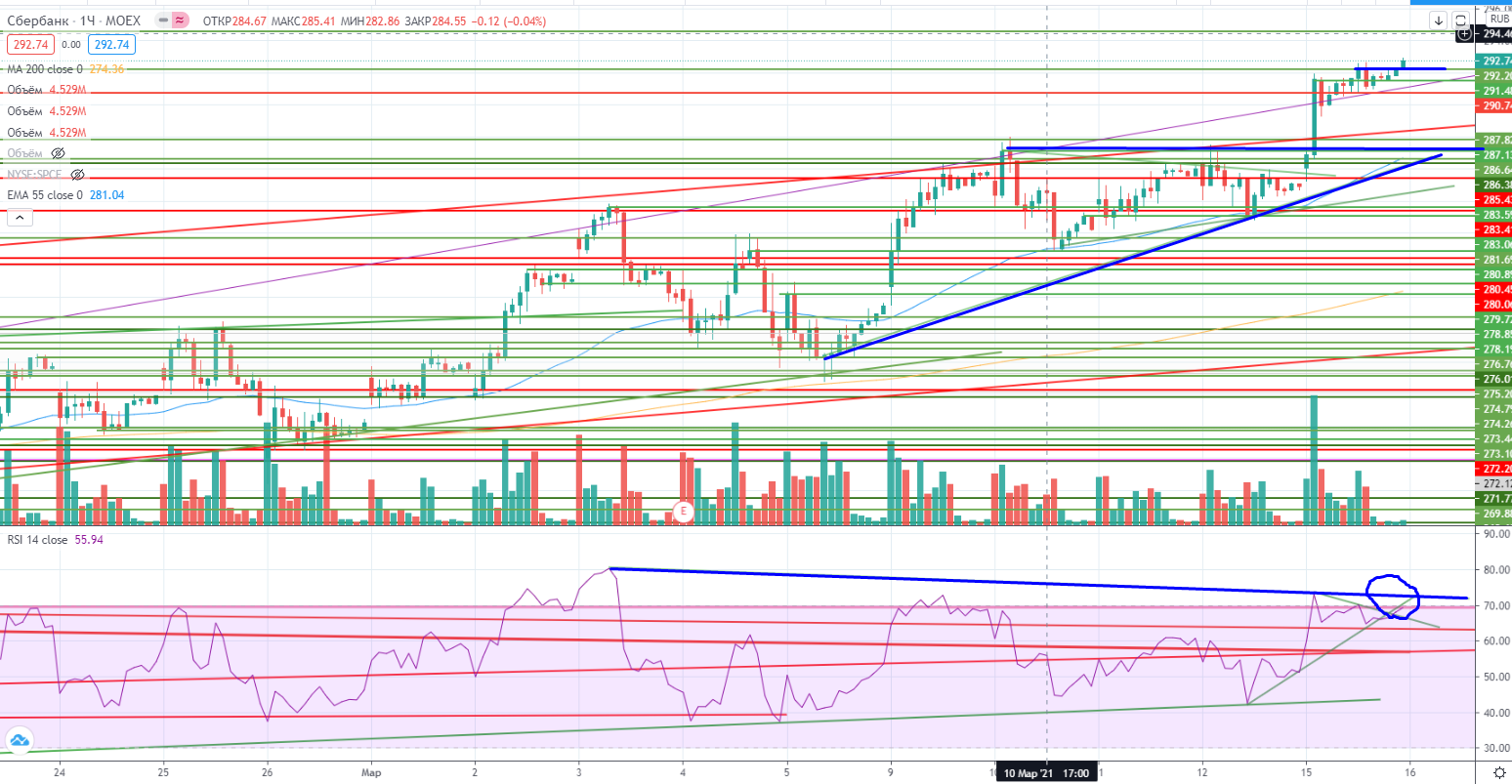 Сбере к примеру пройдено сопротивление 290,88, а на часах страшная дивергенция. Но это не значит, что нужно продавать. На коррекции (теперь уже возможной) надо находить уровни для покупки. Точных уровней пока нет, возможно уровнем можно считать 287,1+, или крайний хай 292,14, но нужно смотреть по ситуации.