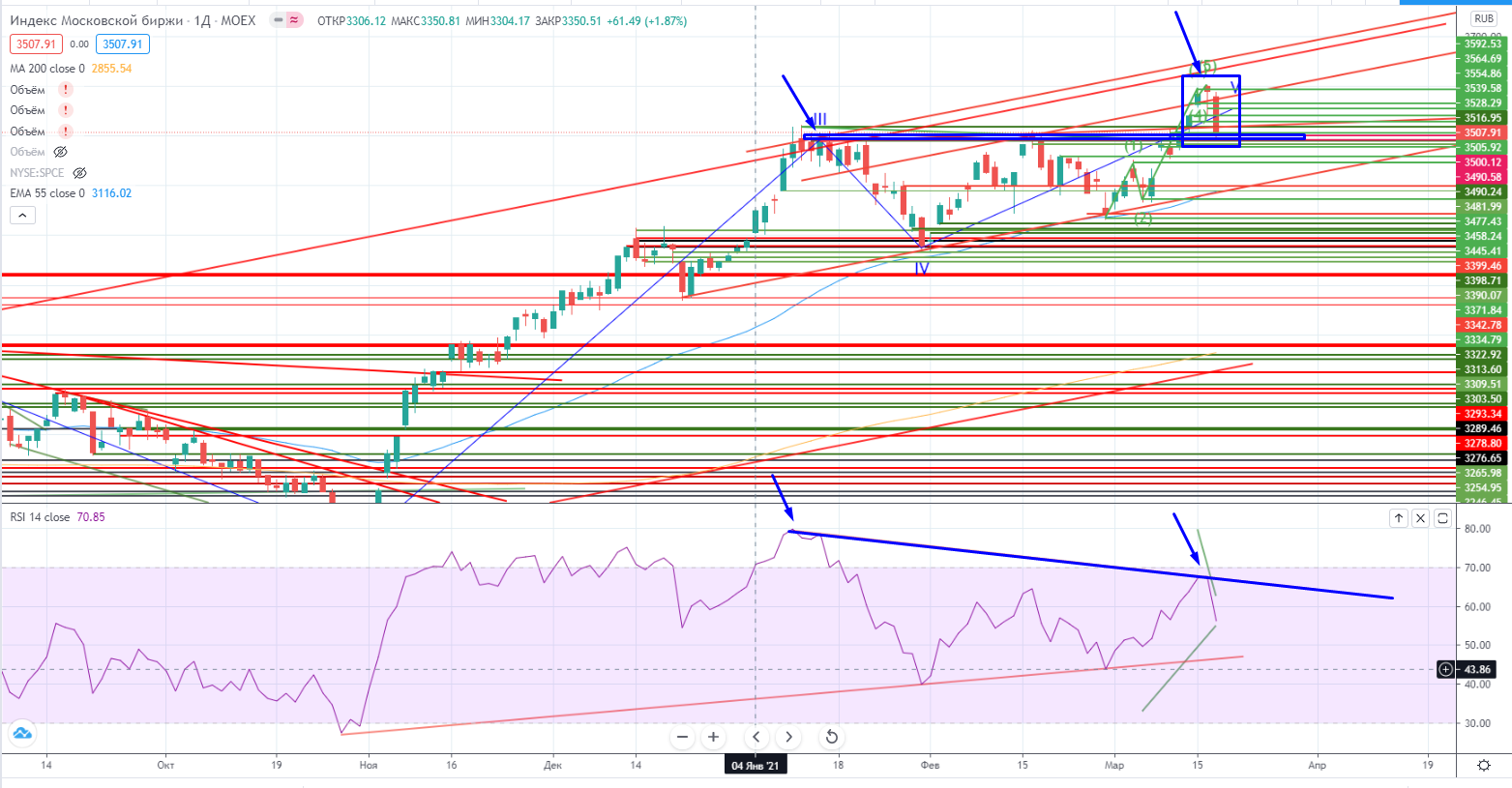 Индекс ММВБ нарисовал страшную свечу подтверждение разворота. Но еще на пройден зона бывшего исторического хая 3490-3502, но уже на грани. Возможно рост и продолжится, но уже более осторожный. Теперь во многих бумагах появились новые уровни для шорта (я еще накануне писал об этом ( https://www.finam.ru/analysis/marketnews/nelzya-predskazat-dalneiyshee-povedenie-rynka-20210317-09200/).Но обо всем по порядку.