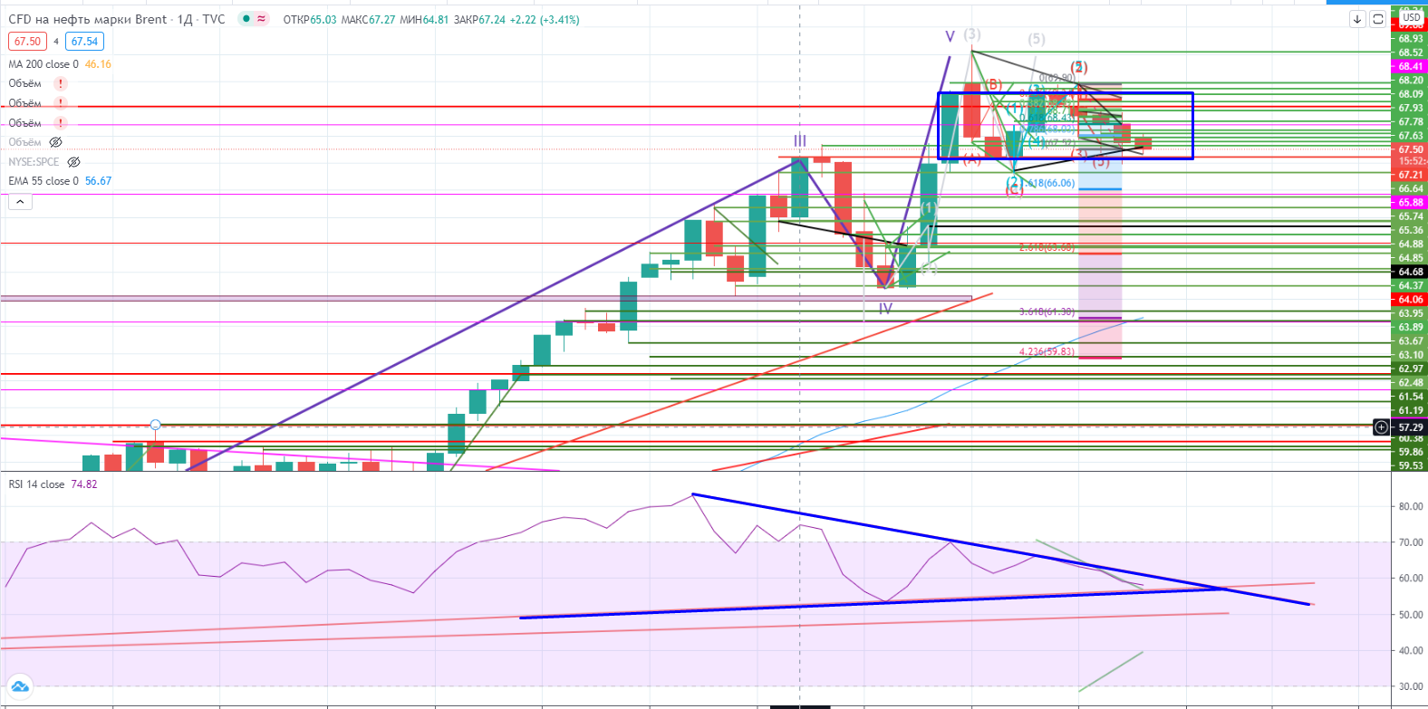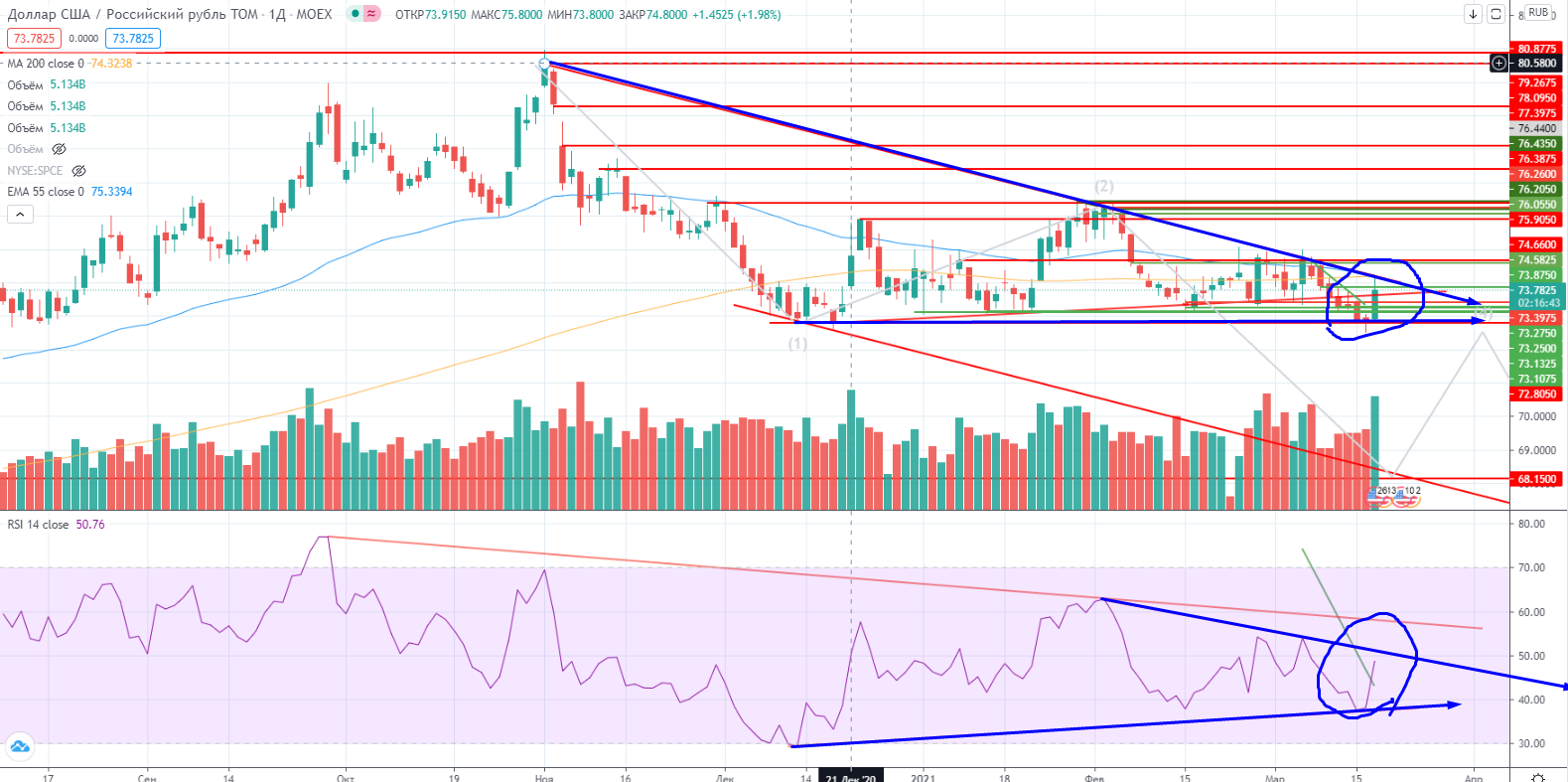 На фразе Байдена по отношению к Путину, USDRUB устремилась вверх, но при этом она все еще в клине, так что пока все в рамках этого, и RSI это подтверждает. Впереди заседание нашего ЦБ и возможные санкции, как отреагирует наш ЦБ и рубль пока не ясно совсем!!!