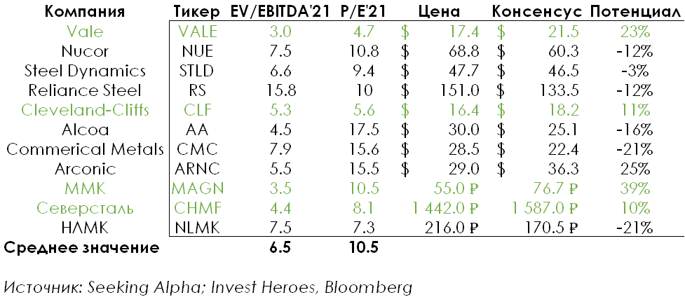 Российские сталевары выглядят более привлекательными, чем зарубежные аналоги. Средняя EV/EBITDA’21 для российских акций составляет 5.2х против 7х у зарубежных аналогов. По показателю P/E’21 также лучше смотрятся российские акции — 8.6х против 11.2 соответственно.
