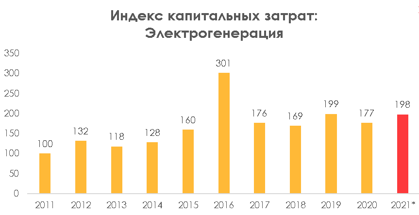 Электрогенерация имеет цикличное движение обновления мощностей — последний суперцикл был в 2016 году. В 2021 году с восстановлением экономики инвестиции в капитальные затраты вернутся на уровень доковидного 2019 года, что сулит рост капитальных затрат на 12% в 2021 году:
