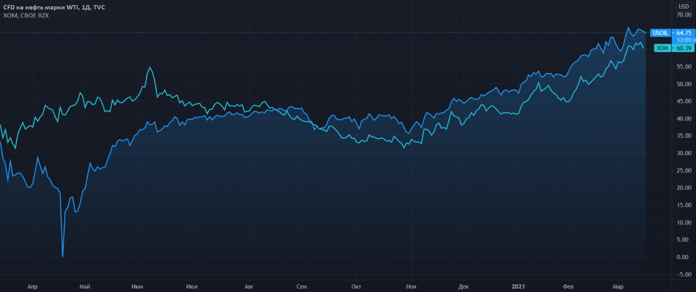 Вот пример, как цена на нефть марки WTI коррелирует с ценой акций нефтедобывающей компании ExxonMobil:
