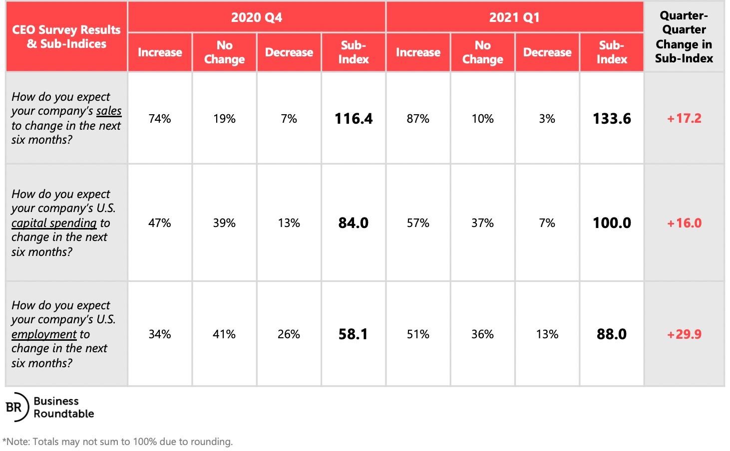 Согласно последнему опросу, количество CEO, которые ждут рост продаж в следующие 6 месяцев, выросло с 74% до 87%, при этом негативный сценарий ожидают только 3% CEO, что в два раза ниже показателя прошлого периода.