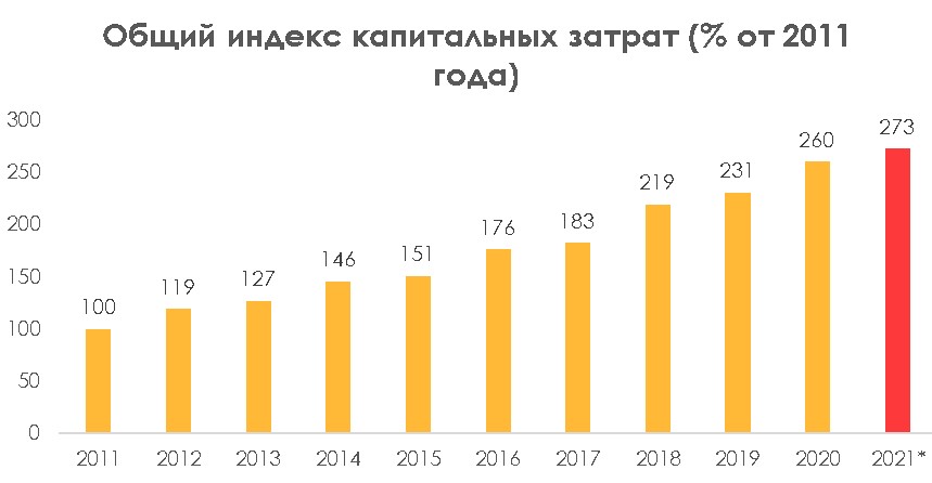 Мы составили собственный индекс капитальных затрат, проследив динамику капиталовложений с 2011 года (базисный год) для топ-5 компаний в каждой индустрии. Если Индекс Блумберга показывает динамику роста/падения в относительных цифрах, то наш индекс опирается на абсолютные значения капитальных затрат. В качестве прогноза 2021 года использовались прогнозы самих компаний или прогнозы аналитиков.
