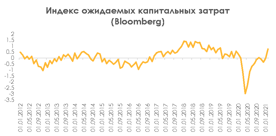 В целом управленцы крупных компаний позитивно настроены относительно восстановления экономики и готовы расти вместе с ней. Это показывает и другой показатель — Индекс ожидаемых капитальных затрат от Bloomberg находится выше уровня 2019 года: