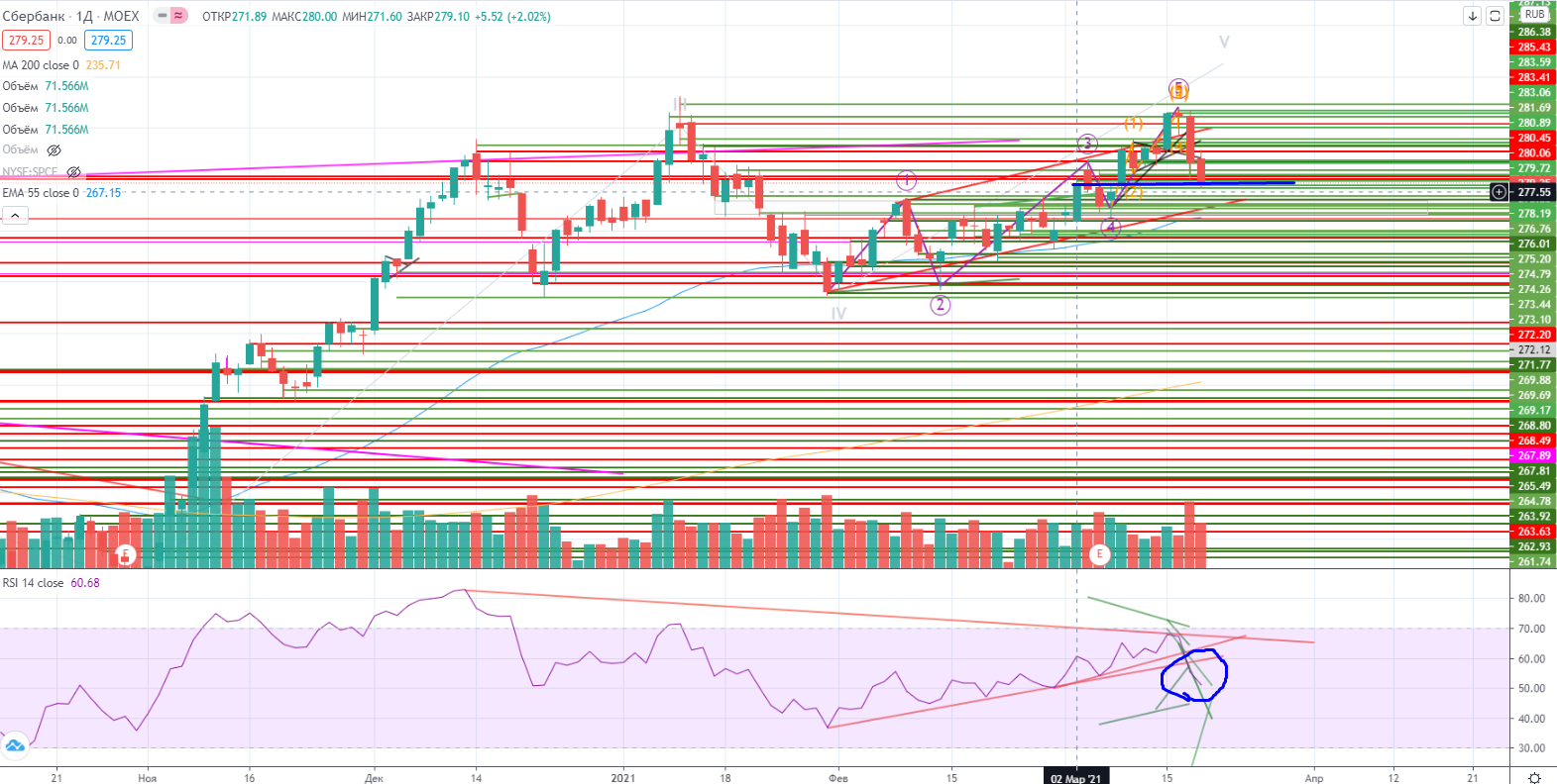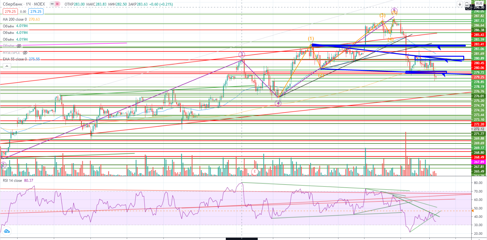 Сбер снова остановился над зоной поддержки 279,1, здесь 50/50 вверх/вниз. Но я для себя определился со стратегией, по крайней мере в Сбере - от шорта. Мне было достаточно урока, который мне преподнес рынок в среду. Надо находить уровни и шортить, стопиться и снова шортить, пока эти уровни не иссякнут. И только после этого я буду рассматривать его с точки зрения лонга.