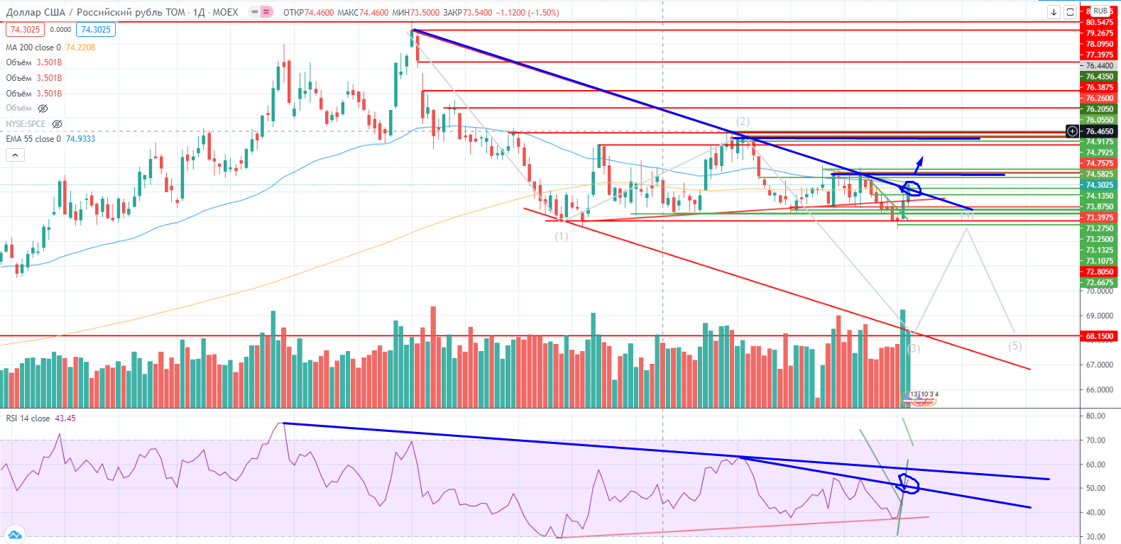 USDRUB daily—пробил свой тренд и RSI также пробил его. Но для пущей убедительности нужно пробивать уровень 74,75, и тогда дорога для роста доллара откроется с новой силой..
