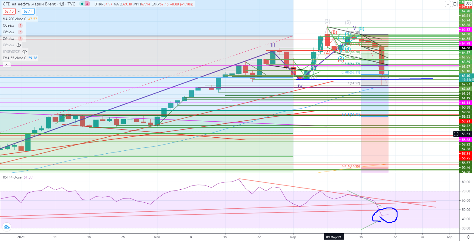 Вчерашний рынок наконец-то ознаменовался мощнейшим проливом в нефти. Я уже несколько раз утверждал, что нефть была крайней для вложений денег инвесторов, что это очередной «пузырь», который должен хоть чуть-чуть спустить пар, так и произошло. Падение было стремительным, в моменте было аж -9,5%, оно и понятно-бычьи стопы и спекулянты внесли свою лепту. То, что растущий тренд сломлен - ОДНОЗНАЧНО! Остается вопрос-до куда может упасть? Если верить графикам, то первая остановка случилась на уровне $62,40, была паника, но не было дивергенции ни на часах, ни тем более на днях, так что могут пронести и ниже. Расплата пришла. Логика постепенно восстанавливается… Я доволен!!!