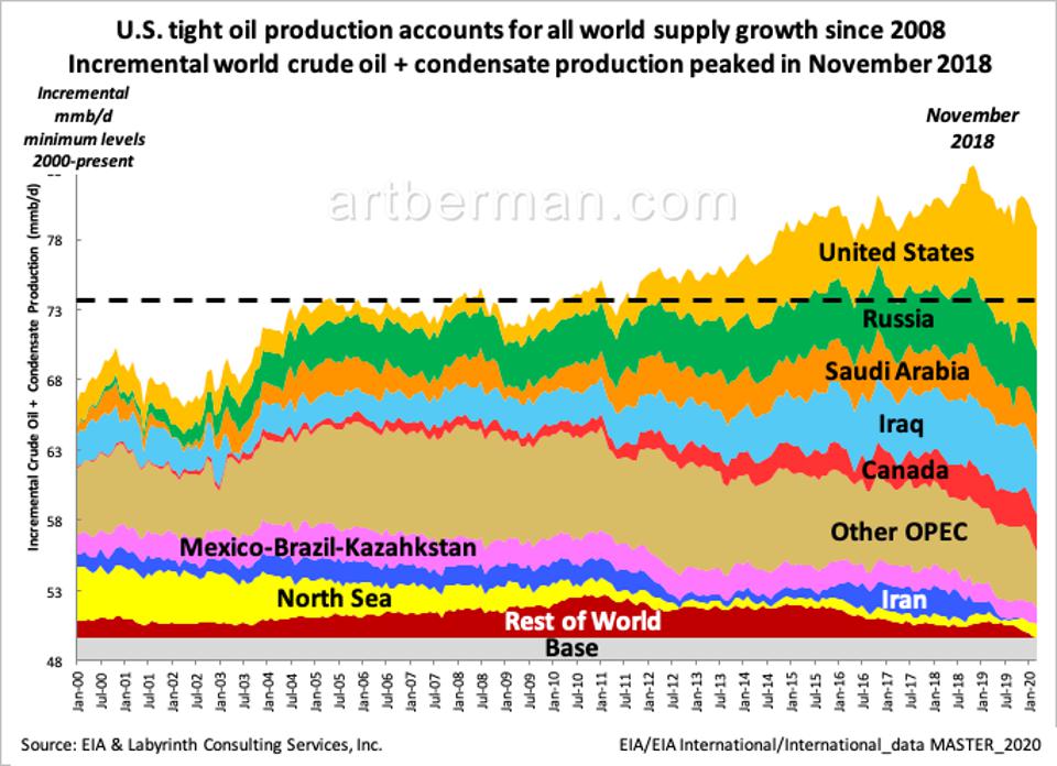 Получается ситуация, когда спрос будет расти, картельная нефть будет возвращаться, но меньше из-за общего устаревания скважин, сокращения кап. программ и совокупной недоинвестированности в добычу. В США вообще при текущем уровне бурения вскоре можно ожидать совокупную добычу в 7-8 млн барр./сутки (на 5-6 млн барр./сутки ниже, чем добыча в 2019 г.).