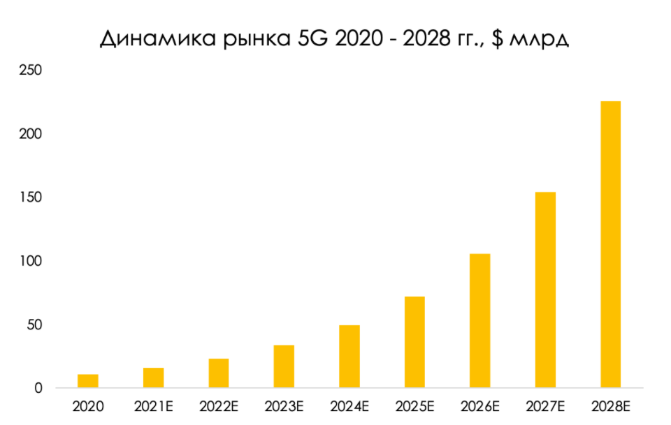 Объем рынка 5G отличается высокими темпами роста. Согласно данным исследовательской компании Grand View Research, объем мирового рынка 5G к 2028 году достигнет $225 млрд, а среднегодовой темп роста будет на уровне 46,2% в год.