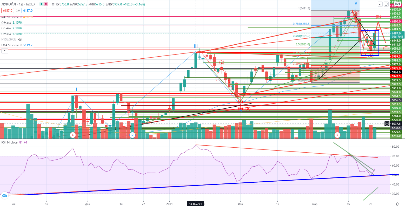 А вот в Лукойле однозначно начало волны В (разворотная формация+RSI отскочил от своего дивергентного тренда). Локально лонг возможен, но на откате, сейчас уже поздно покупать…