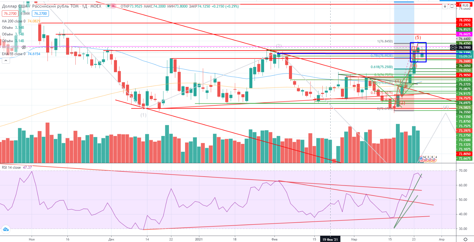 Я снова был вынужден отлучится по личным делам в середине дня. И не зря. Я подозревал и предупреждал, что коррекция от падения не за горами (https://www.finam.ru/analysis/marketnews/korrekciya-ot-padeniya-ne-za-gorami-20210324-09400/), так и случилось. Индекс ММВБ нарисовал пока отскок-намек на окончание локальной волны А. Но нужно подтверждение хотя бы еще одним растущим днем. Ситуация пока не понятная, толи это локальная коррекция в рамках волны А, толи реально начало волны В. Все решится в ближайшие дни!!!