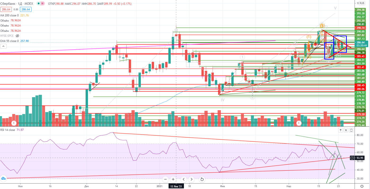 Сбер на днях (да и на часах тоже) заблудился, торгуется скорее в треугольнике, череда «типа разворотных» формаций очень утомляет. Лучше в стороне стоять до выхода в любую сторону!!! Деньги и нервы целее будут!
