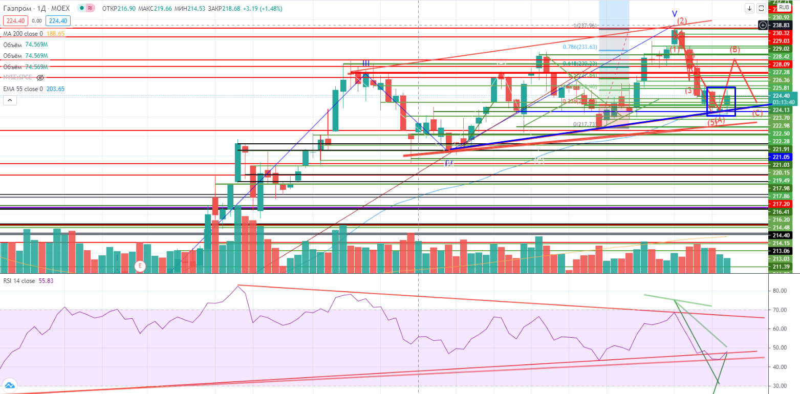 Газпром-похоже тоже на разворотную формацию на днях, поддержка 221 оказалась крепкой, пришлось перерисовать тренд в RSI (но это не страшно- все таки RSI только индикатор-цена важнее). Также локально можно покупать, но осторожно, т.к. Газпром в любой момент может попасть под удар от санкций (их никогда нельзя исключать!!!).