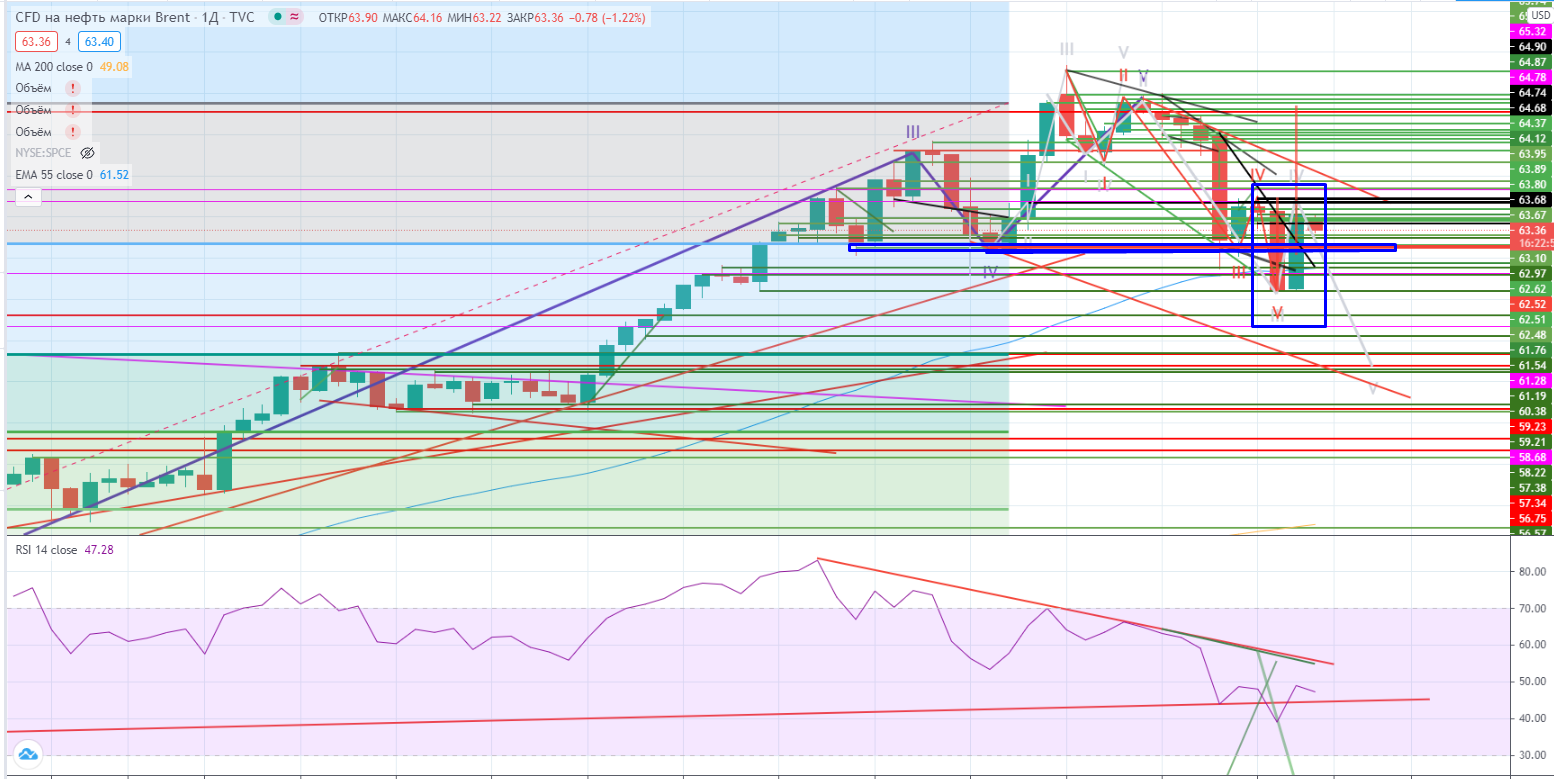 В нефти на споте на часах есть реперная зона 64,6-64,86 (волна IV). Мишень от пробоя тренда также примерно совпадает с этой зоной. Рекомендация-продавать частями под этим уровнем с общим стопом 65,05 (на споте), значит на фьюче +5 пнкт.