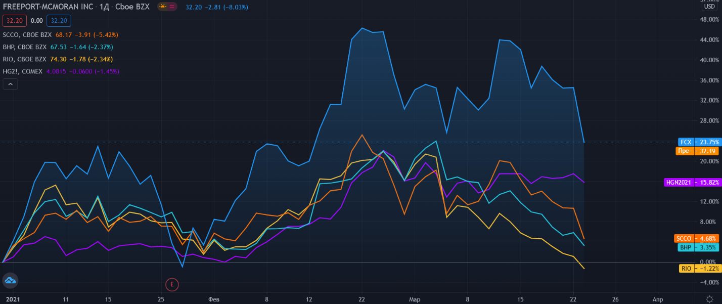 При этом акции майнеров упали сильнее цены фьючерсов на медь, реагируя на дальнейшее снижение цены меди в будущем.