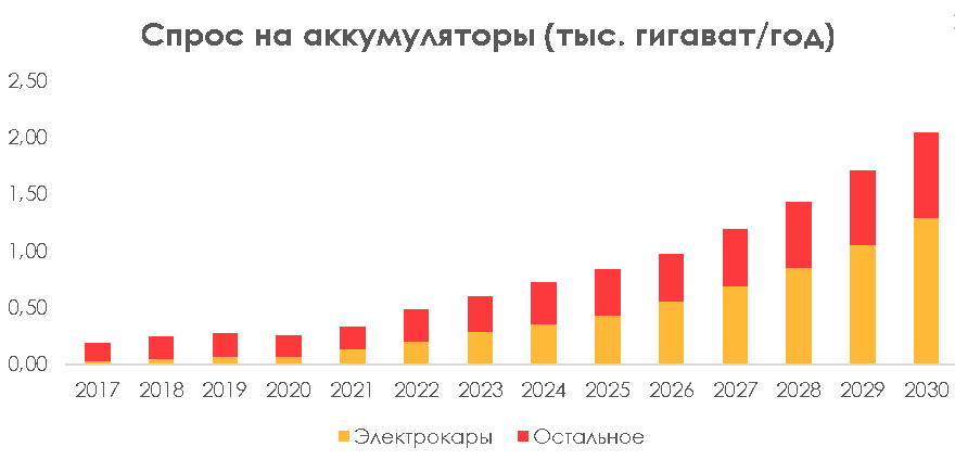 В результате, по данным Bloomberg NEF, потребность в литий-ионных аккумуляторах будет расти в среднем ежегодно на 23% до 2030 года. Причем основной спрос будет формироваться за счет роста производства электрокаров: