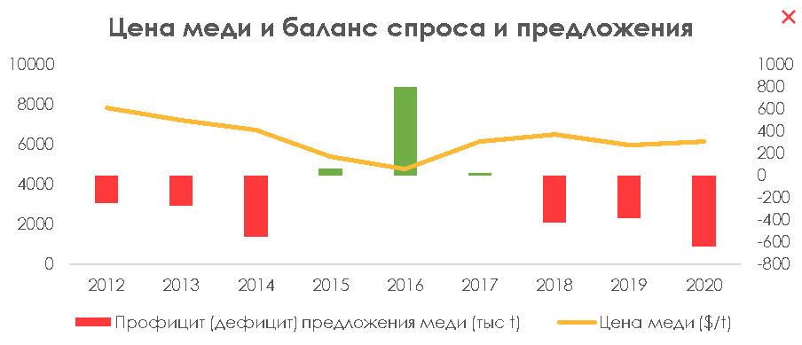 Несмотря на то, что аналитики повысили рост предложения меди с 2,3 до 5% в 2021 году, они ожидают, что при таком раскладе в 2021 году дефицит меди составит 200 тысяч тонн.
