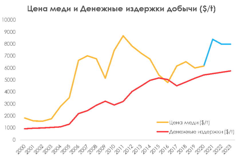 Однако цена на ресурсы не делает резких скачков, поэтому мы ждем среднюю цену в 2021 году на уровне $8400, а в 2022 — на уровне $8000 за метрическую тонну.