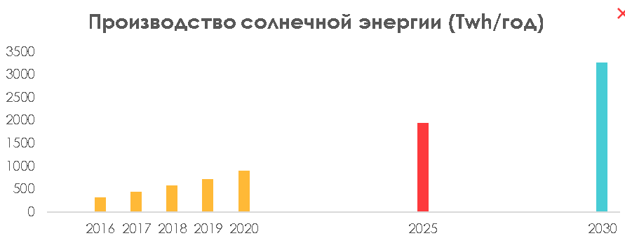 Также зеленая повестка формирует спрос на солнечные панели со стороны многих энергетических компаний, так как солнечная энергия дешевле и чище аналогов и уступает только ветрогенерации. Из-за дешевизны и эффективности, по данным Международного энергетического агентства, спрос на солнечную энергетику вырастет в 4 раза за 10 лет: