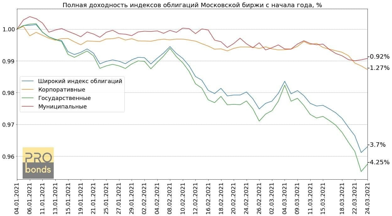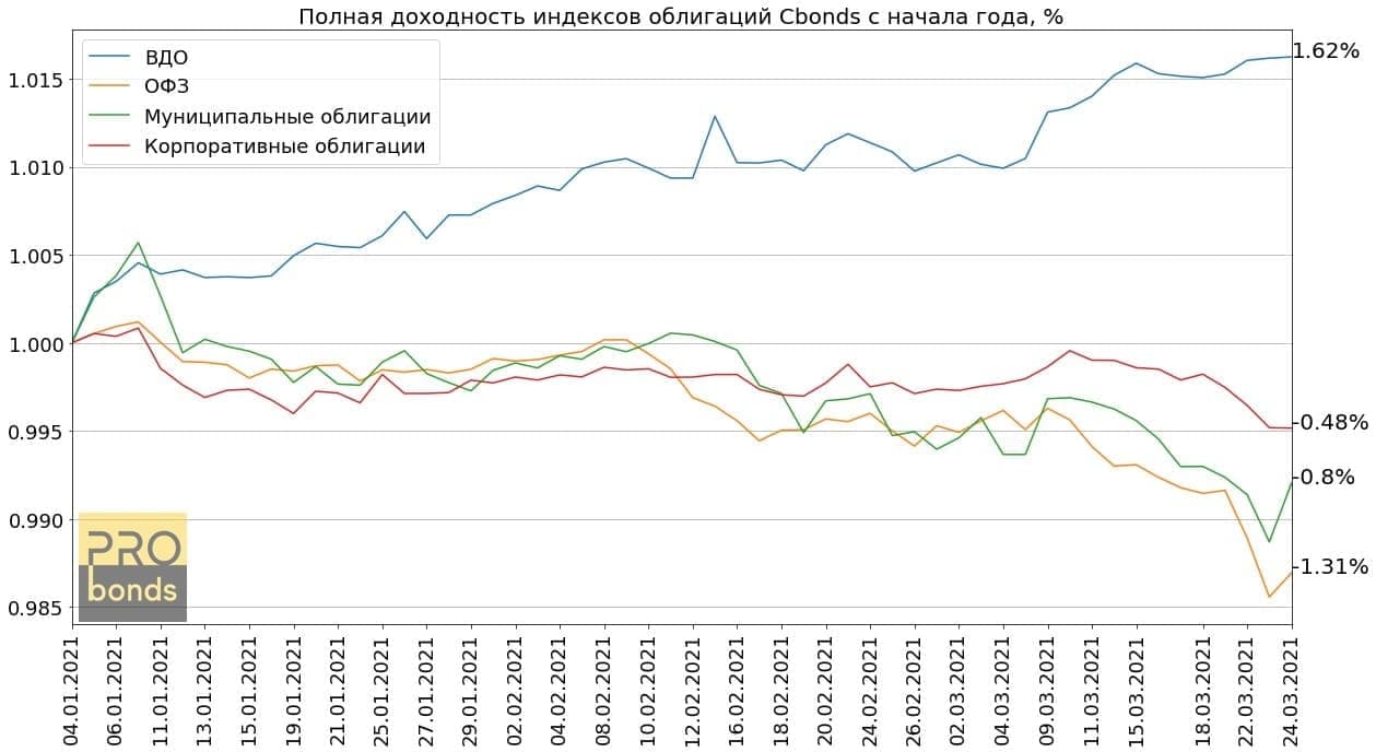 Индекс ВДО единственный показывает положительную доходность с начала года: +1.53% ОФЗ теряют -0.76%, Муниципальные облигации -0.55%, а Корпоративные -0.15%