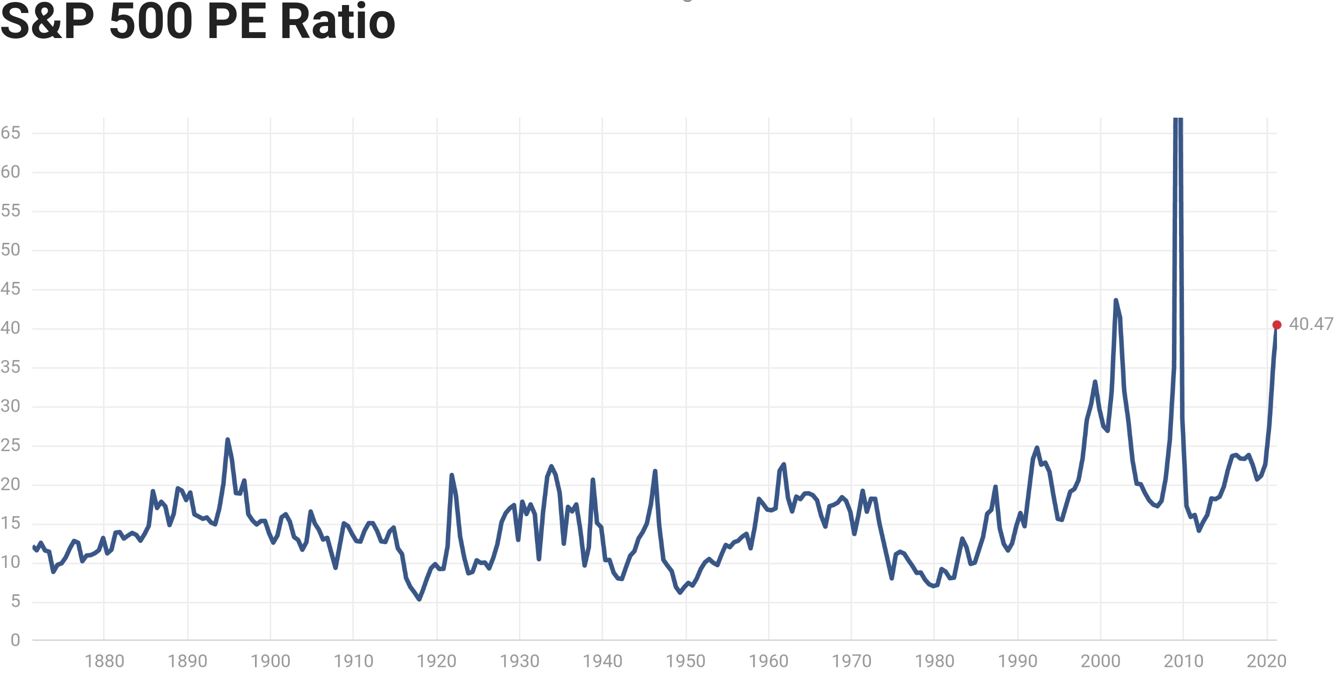P/E индекса S&P 500 уже выше 40 (средний 15, исторический max 123).
