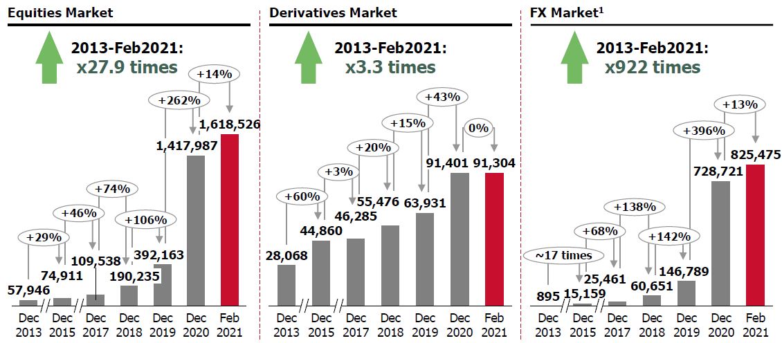В 28 раз с декабря 2013г. по февраль 2021г. выросли активы розничных клиентов на Мосбирже (рост активов, довложения, открытие новых счетов).