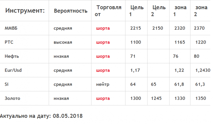 Сильнейшим фактором на сегодня будет являться решение по Иранскому вопросу со стороны Трампа. Вчера Трамп анонсировал что решение это будет сегодня. Моё предположение вчера было, что скорее всего решение будет таким, что надавит на цены на нефть. В тоже время тот же Макрон на выходных заявлял что дело может идти к войне. Так что опять же сегодня просто будем смотреть будут ли соответствовать предположения действительности.