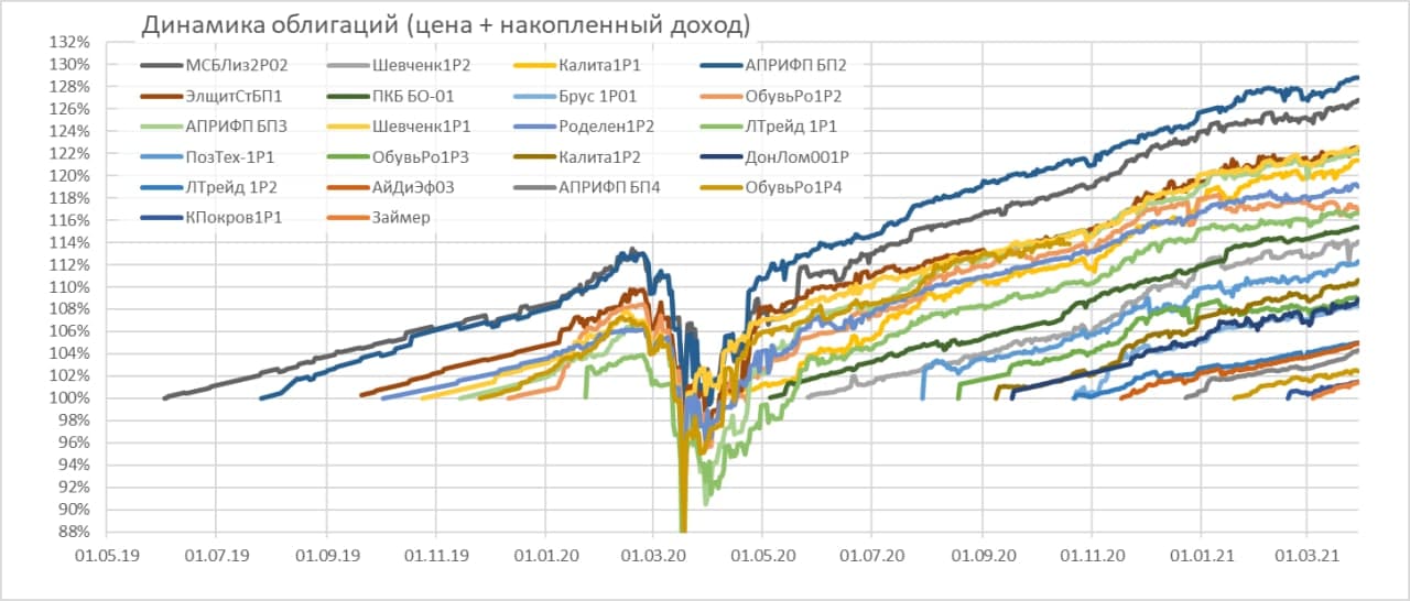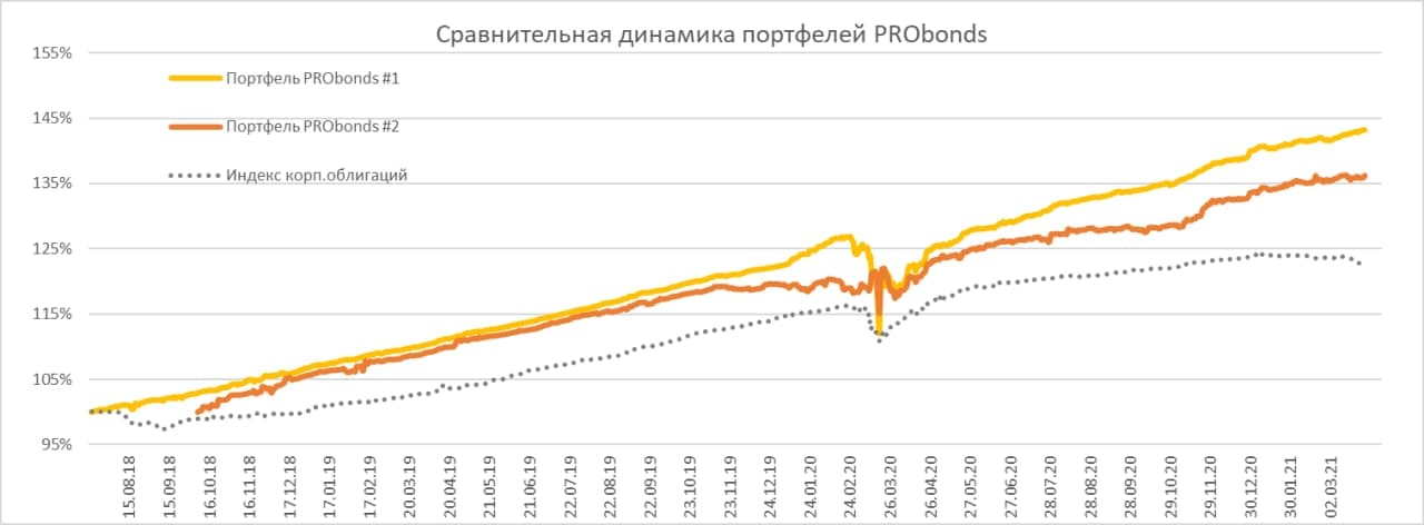 Текущие годовые доходности портфелей PRObonds (за последние 365 дней): 19,6 для портфеля #1, 14,9% для портфеля #2. Высокая доходность объясняется эффектом низкой базы, в прошлом марте облигации стоили существенно дешевле нынешних уровней и имели доходности иногда выше 20%. С начала 2021 года портфели имеют доходности 9,5% и 8,1% годовых. Существенно ниже, чем за 365 дней, однако намного лучше, чем в среднем на рынке облигаций и даже на рынке ВДО (индекс ВДО от Cbonds имеет с начала года доходность 7,8%, и это в отсутствие транзакционных издержек).