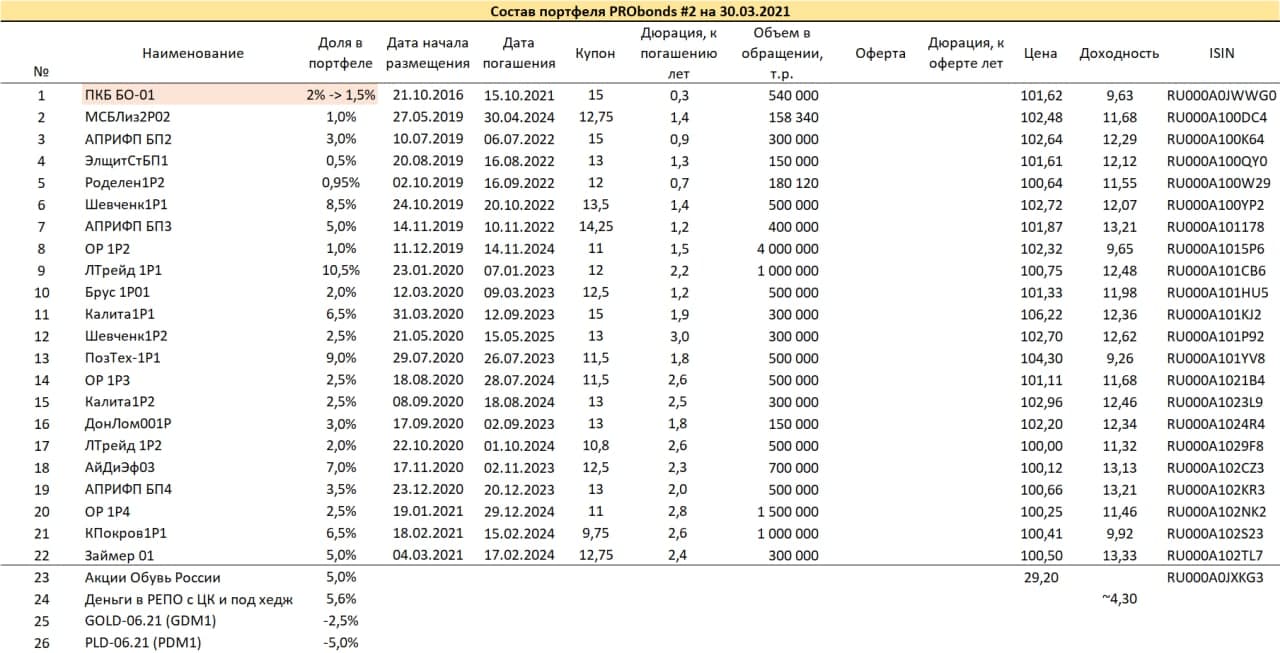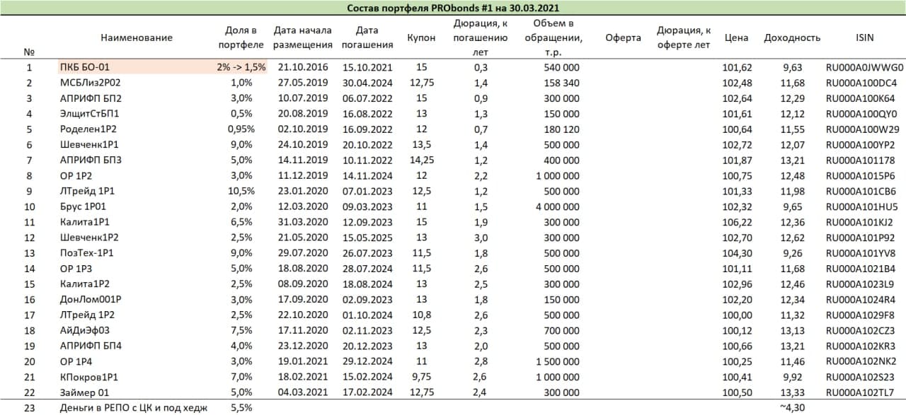 Высвобождение денежной подушки (целевое значение 6% от активов) началось в первой декаде марта и почти завершилось. Сейчас осталось сократить позицию только в бумагах ПКБ, которые амортизируются с приближением срока полного погашения. В апреле мы планируем провести 2 размещения облигаций (13.04 МФК «Быстроденьги», для квалифицированных инвесторов, 22.04 строительная компания «Литана»). Под них потребуется около 7-8% от активов портфелей, тогда как сейчас свободно менее 6%. Так что постепенное сокращение давних или избыточных облигационных позиций продолжится. С середины 2020 года мы почти перестали полностью выводить те или иные бумаги из портфелей, ограничиваясь сокращением их долей.