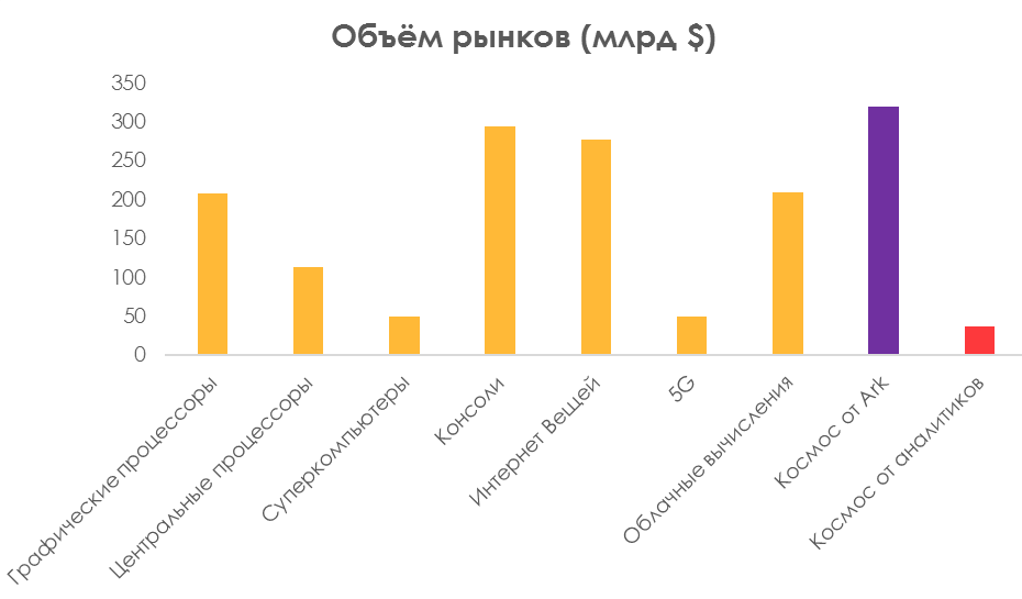 Если взять малые спутники, то Ark считает объём рынка через домохозяйства и широкополосное соединение. А если взять рынок гиперзвукового передвижения, то он рассчитывается от путешествий на частных самолетах. Два этих рынка не могут быть больше, чем рынок технологий, рассчитанный на всех жителей планеты — облачные вычисления, Интернет вещей и 5G.