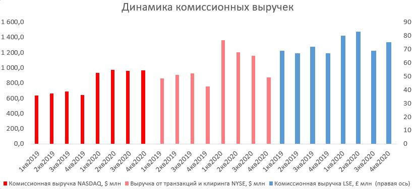 Московская биржа также существенно увеличила как объёмы торгов, так и комиссионные доходы в ходе Коронакризиса. Это помогло вырасти как акциям компании, так и финансовым показателям.